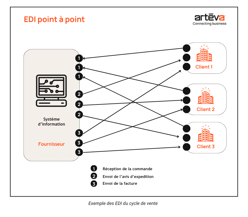 L’EDI point à point repose sur des connexions individuelles entre chaque partenaire. Chaque fois qu’un nouveau client ou fournisseur rejoint votre réseau, une intégration spécifique doit être mise en place.